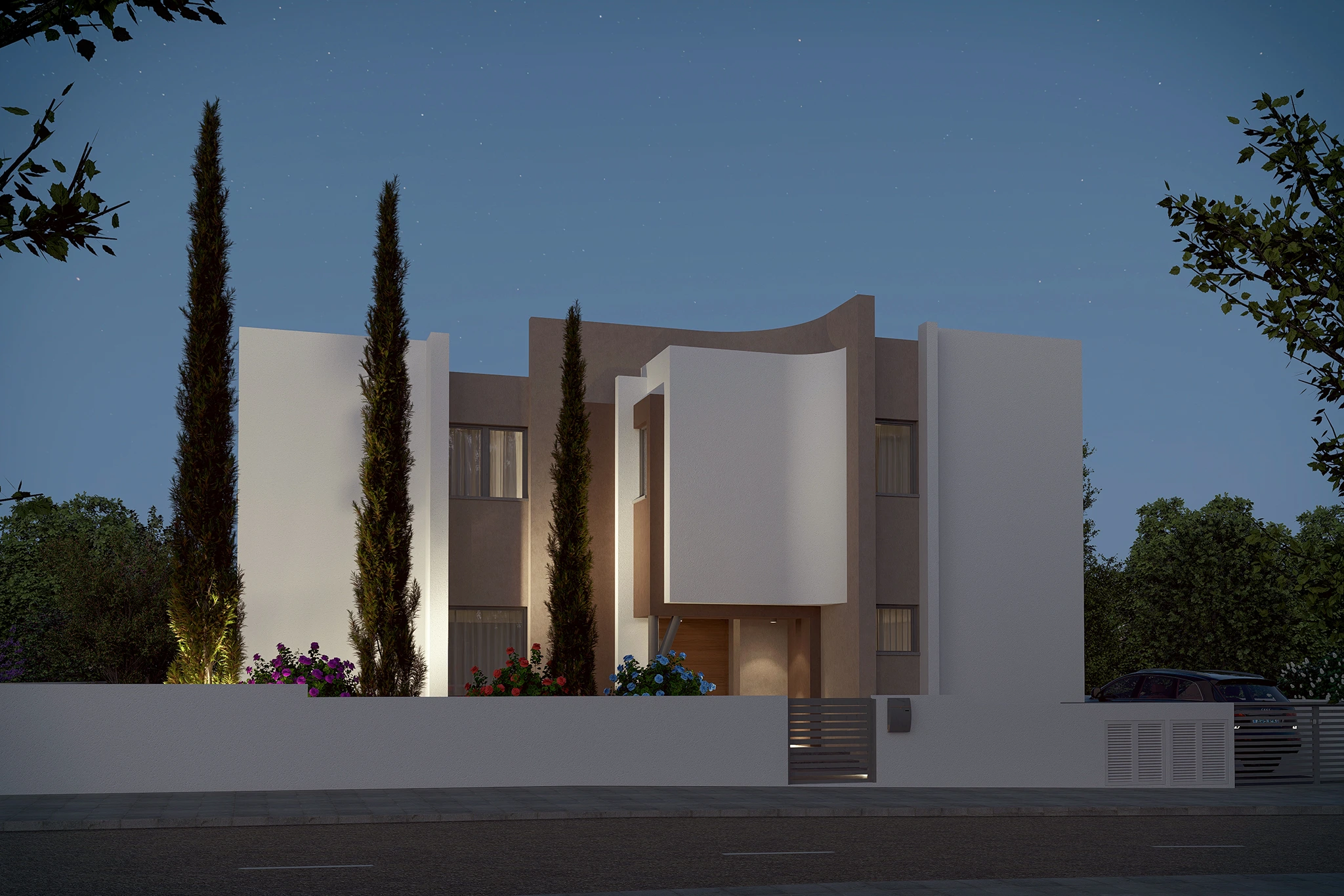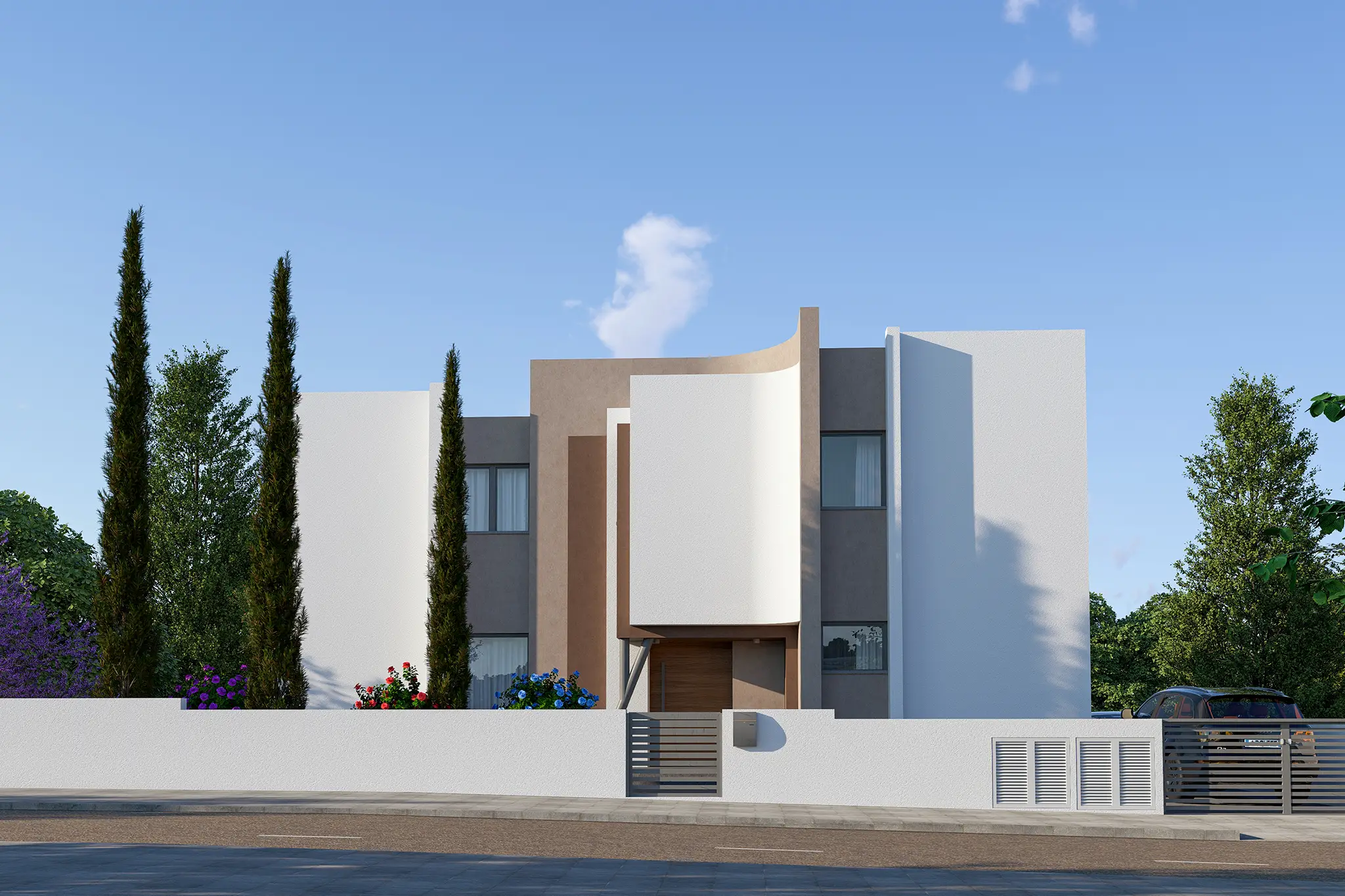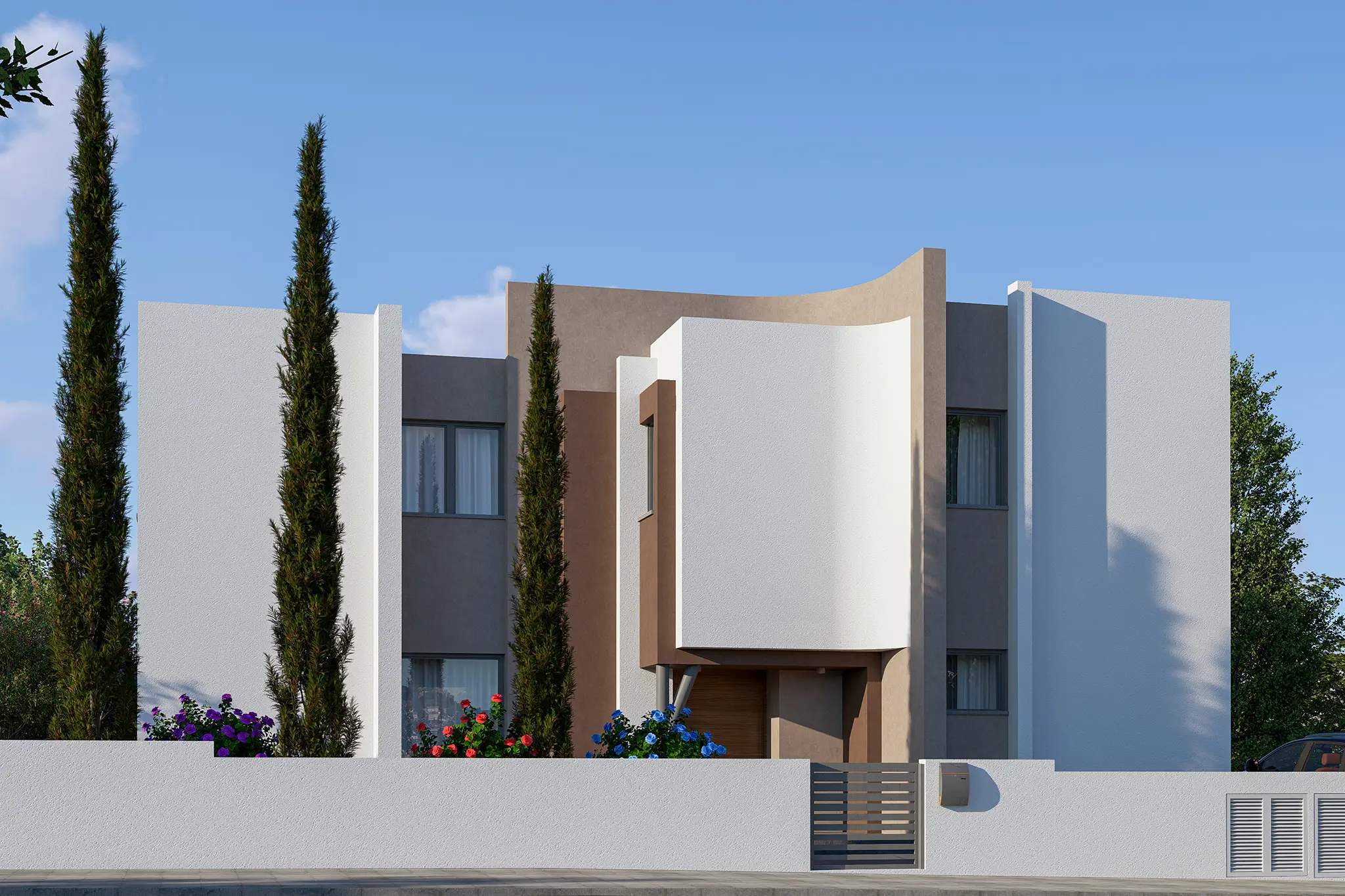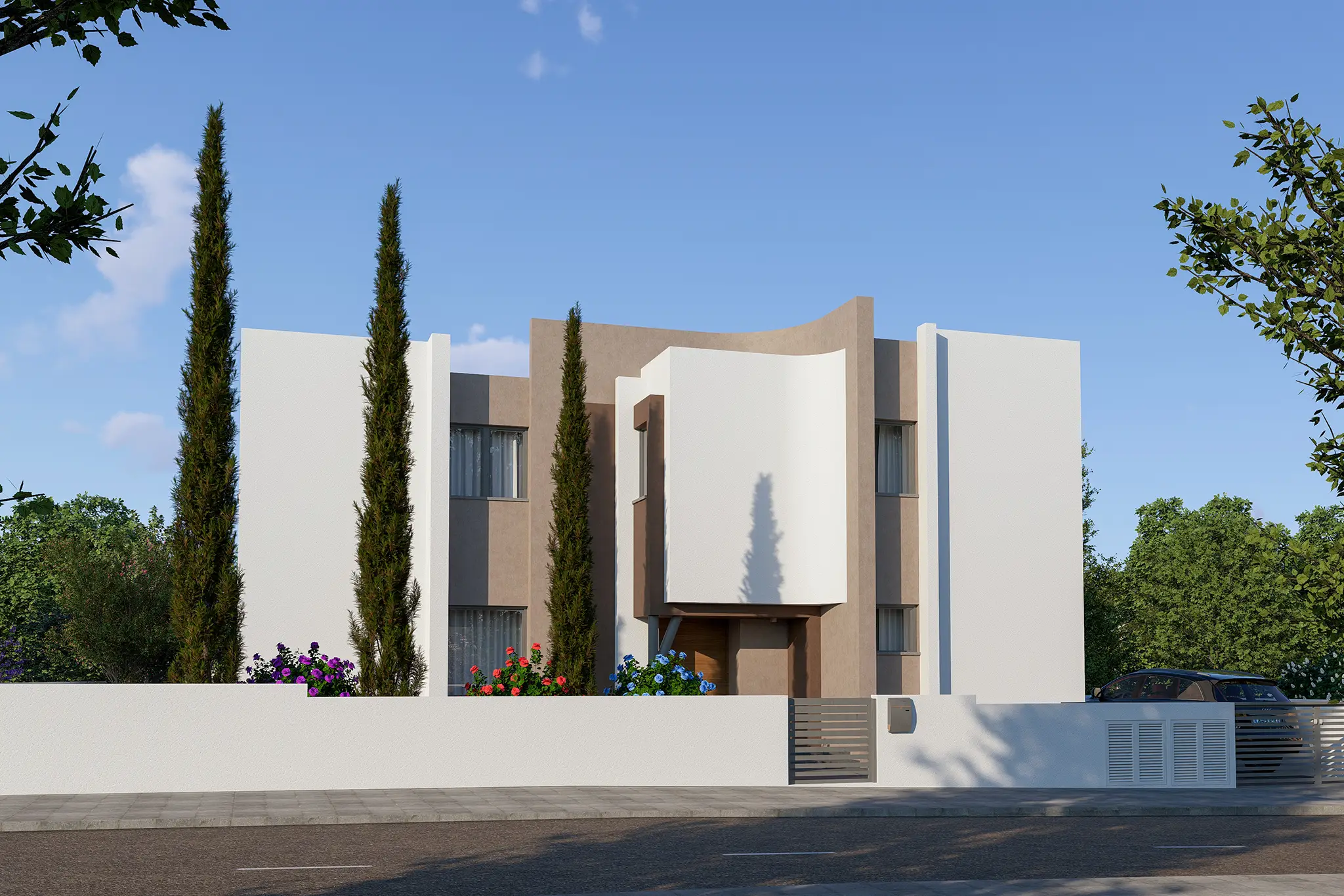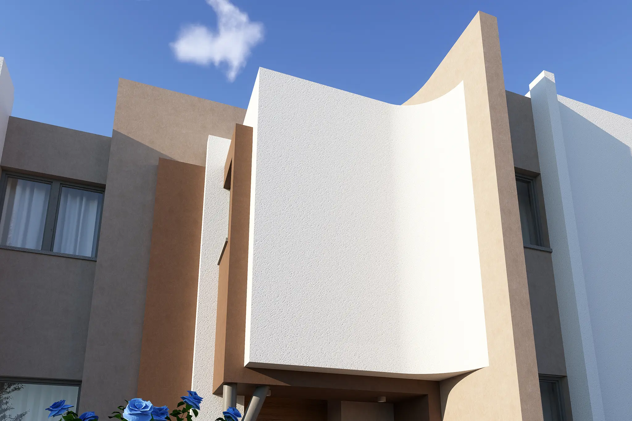 This project showcases stunning modern architecture defined by clean geometry, smooth curves, and a minimalist aesthetic. The lines, natural tones, and a calm atmosphere come together to create a modern and timeless look.