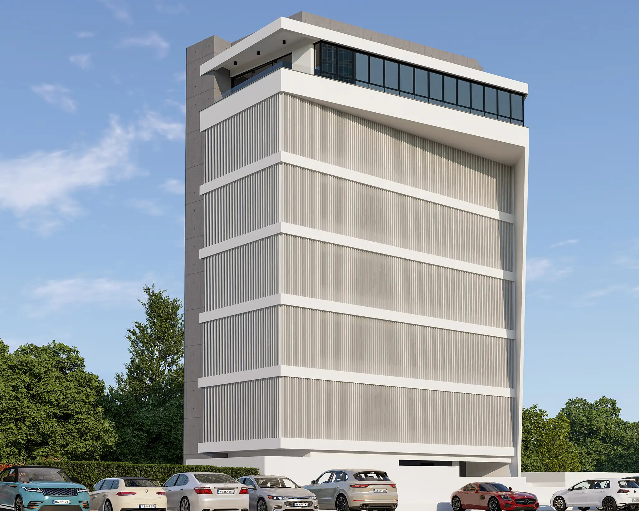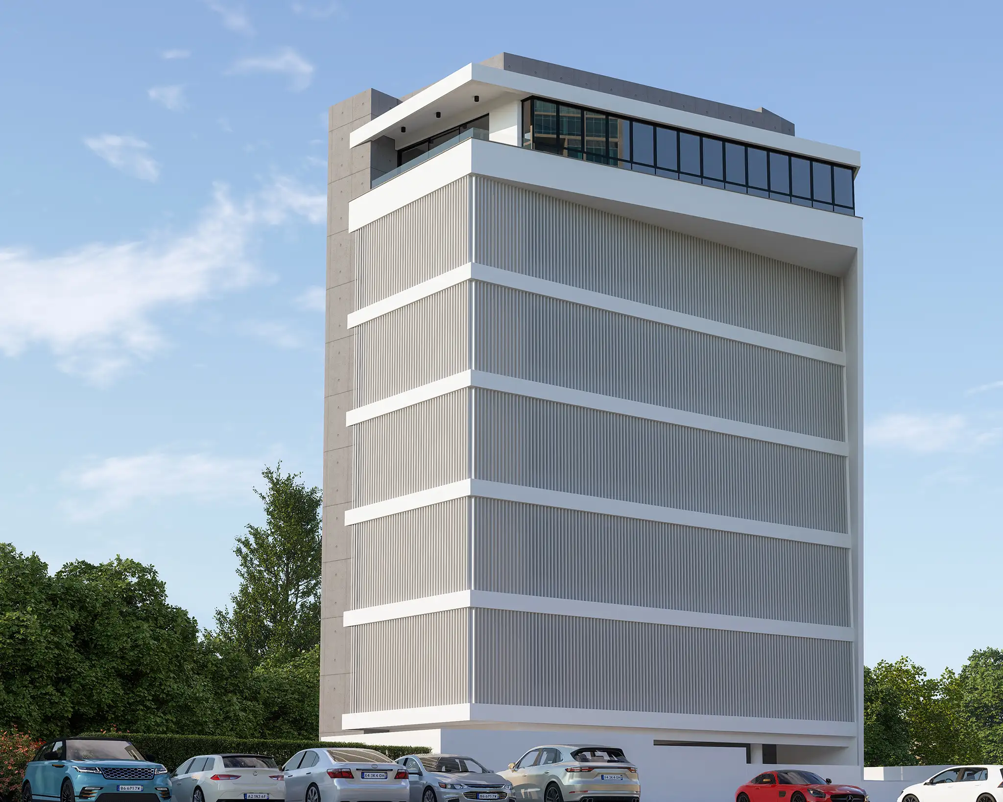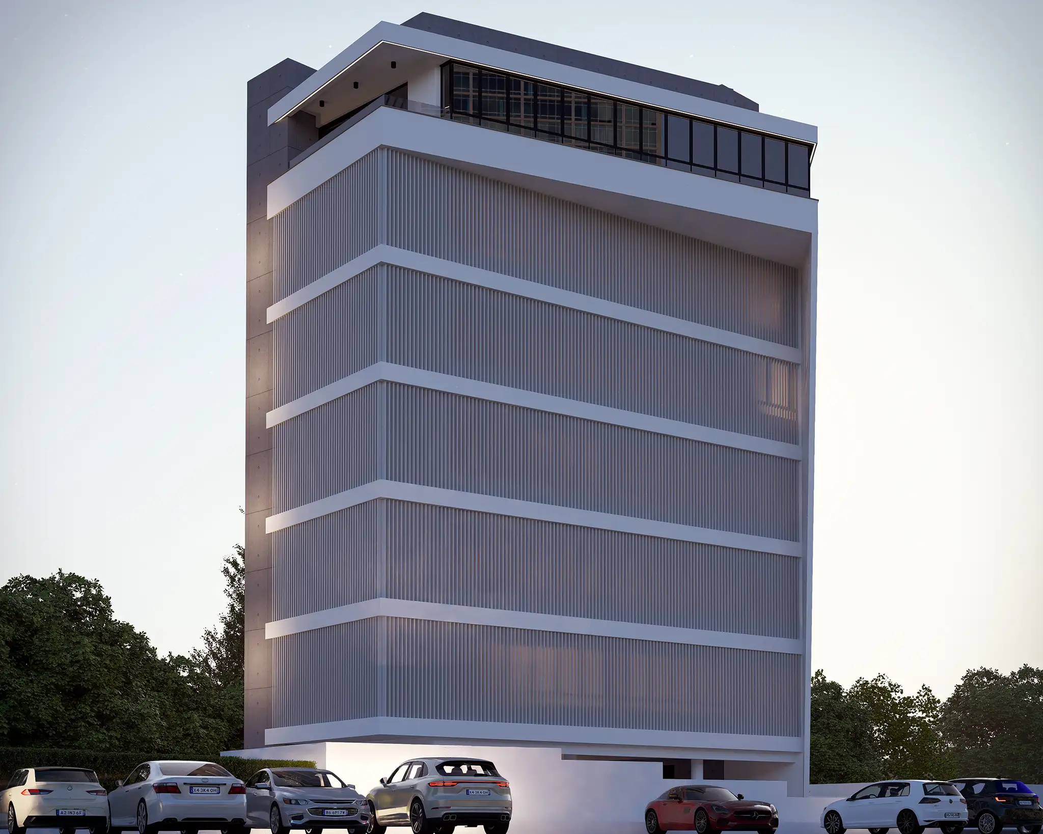 A modern 7-story office building designed with clean lines and a bold angled facade. The vertical louvers provide shade and privacy, while the top floor’s glass walls offer great views and natural light.
