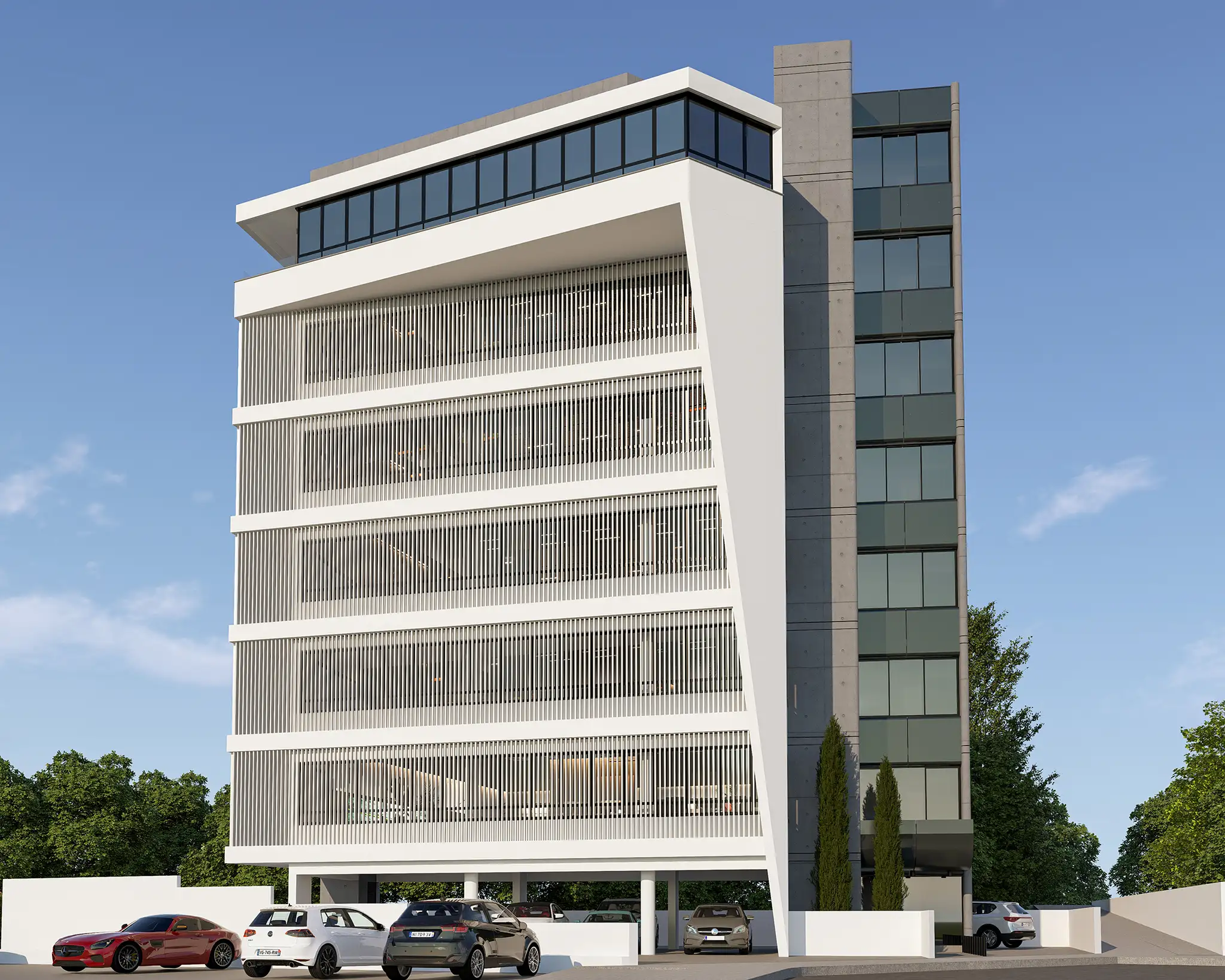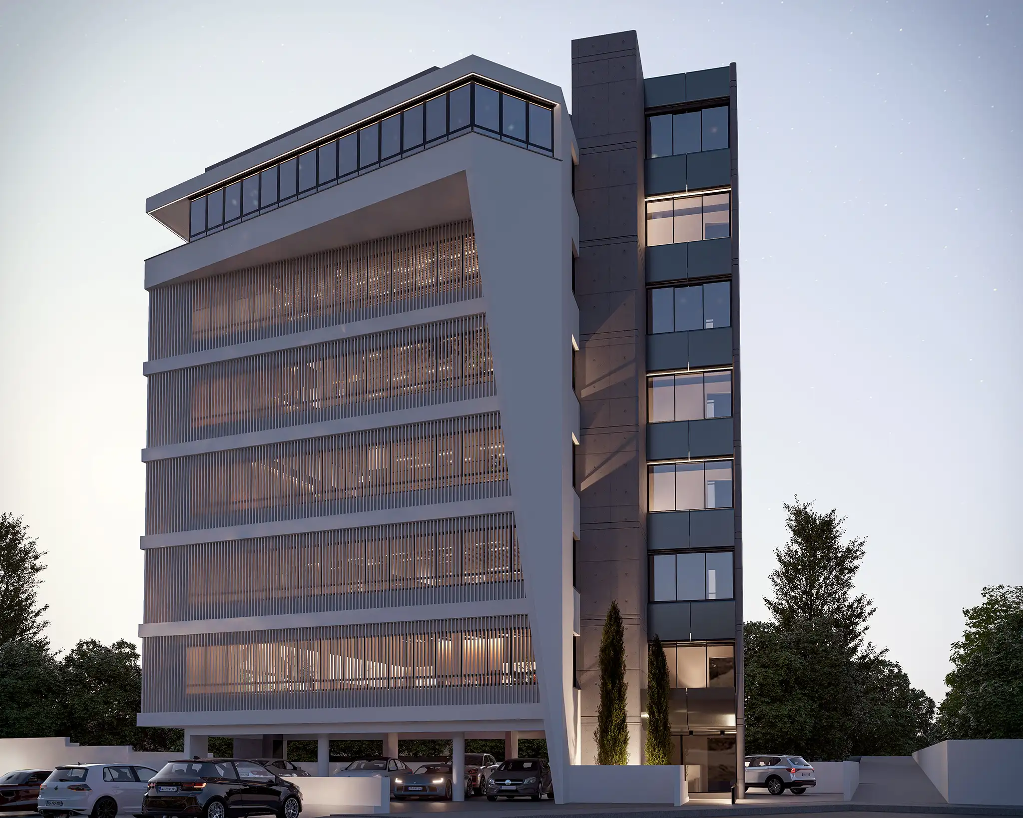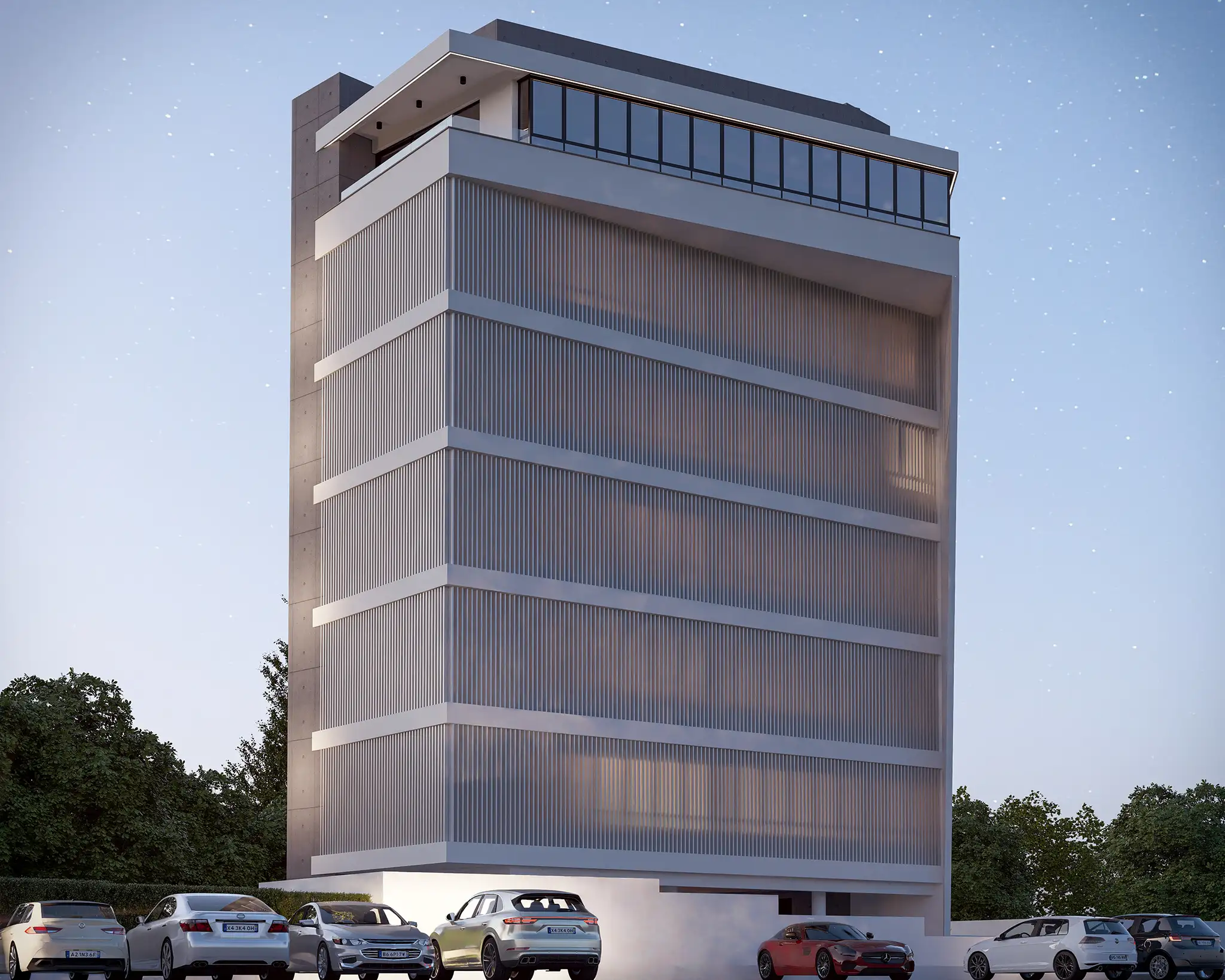A modern 7-story office building designed with clean lines and a bold angled facade. The vertical louvers provide shade and privacy, while the top floor’s glass walls offer great views and natural light.