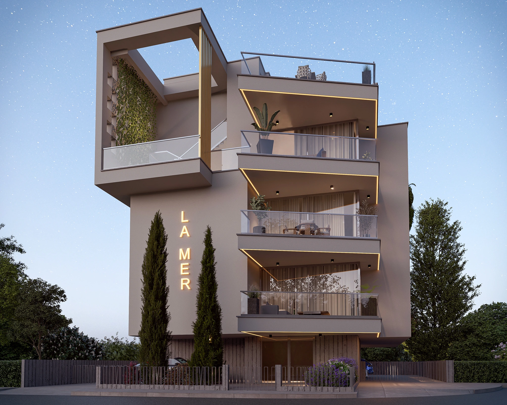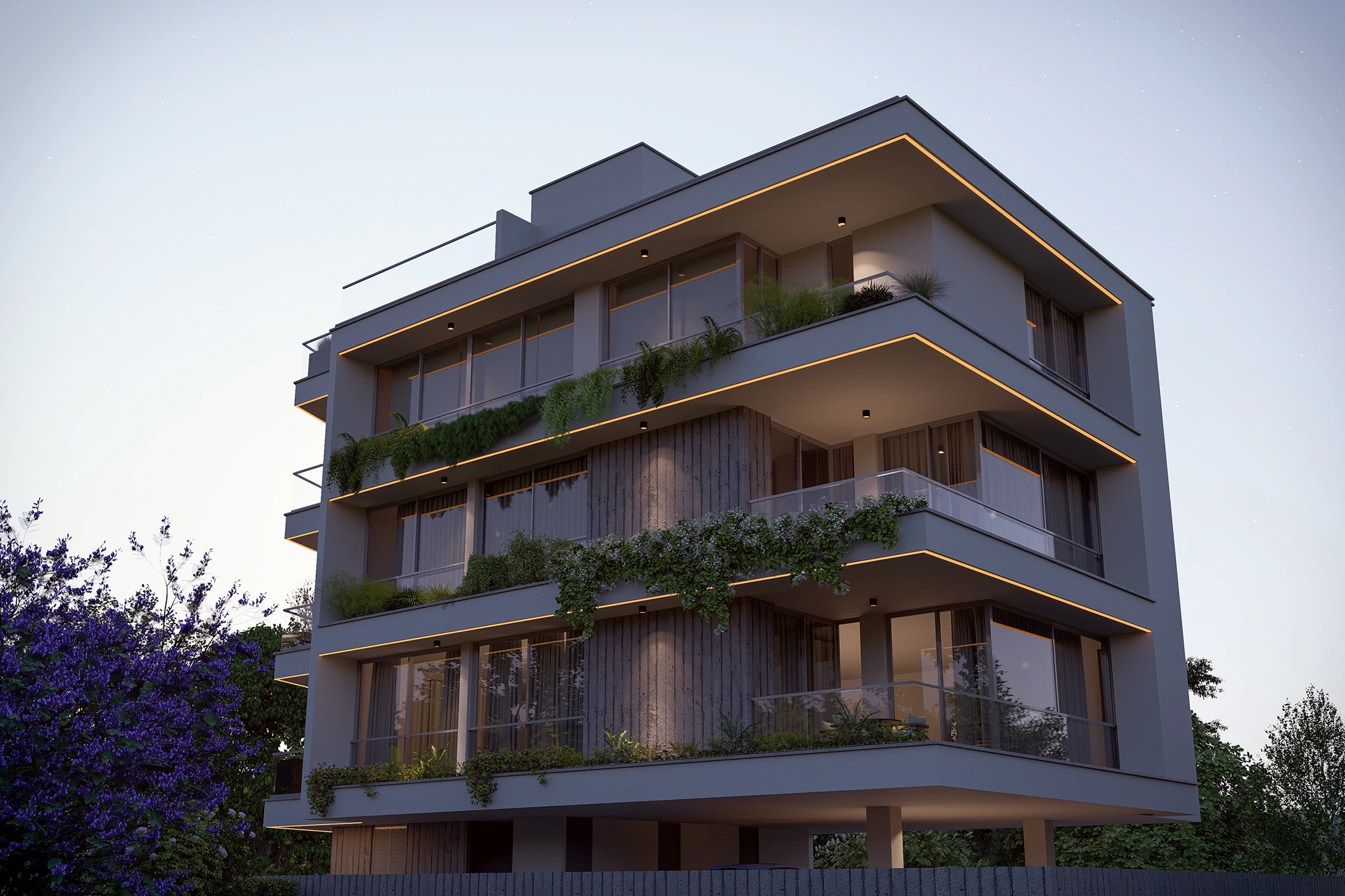 A fresh take on modern living, with glass façades, generous balconies, and landscaped surroundings. Day and night views reveal the building’s refined geometry and subtle lighting, blending sophisticated design with a natural setting.