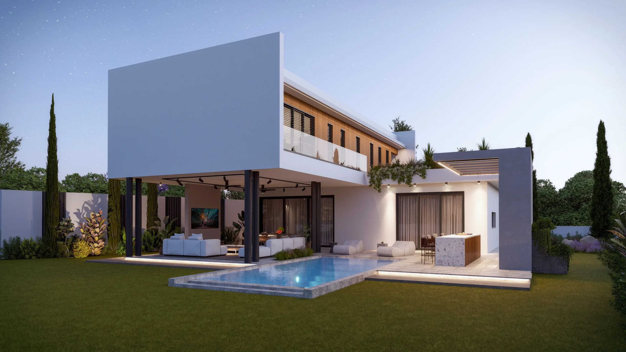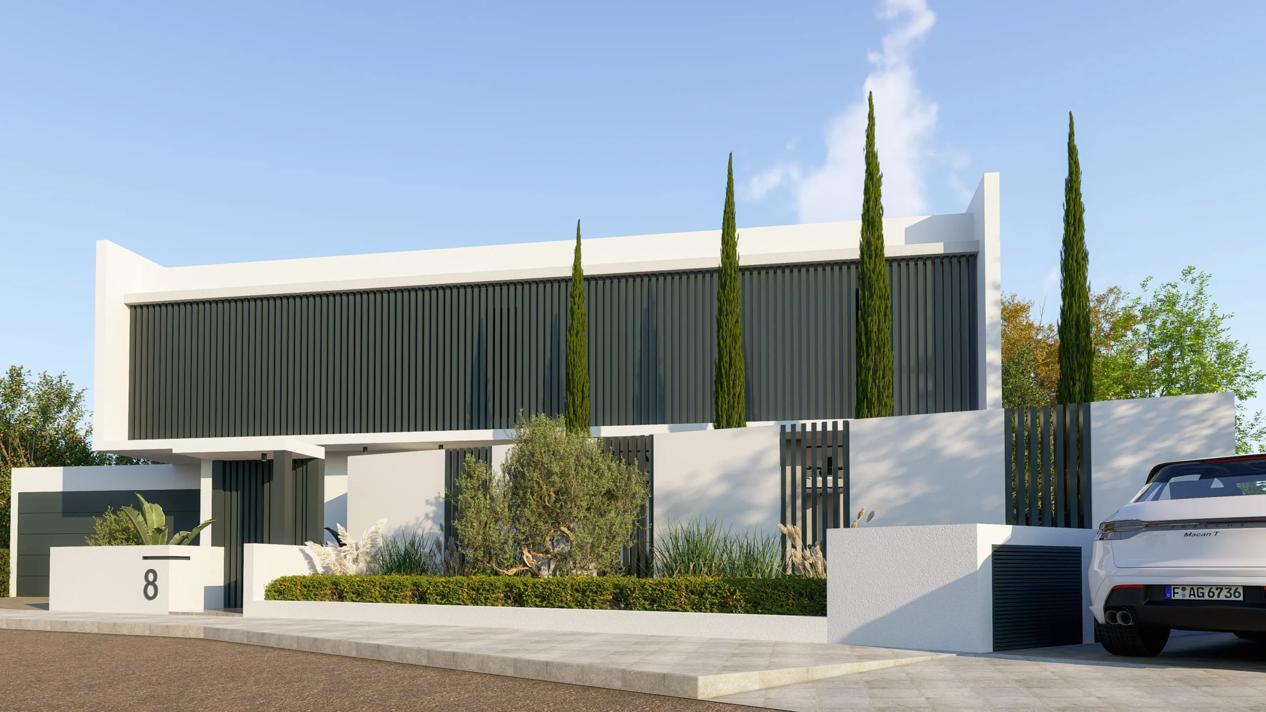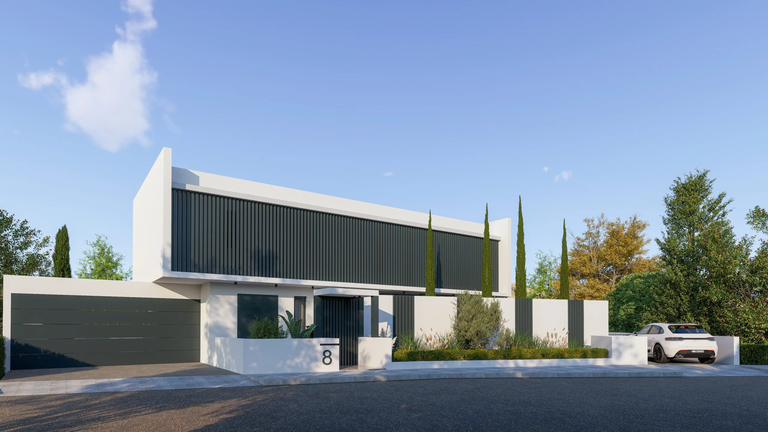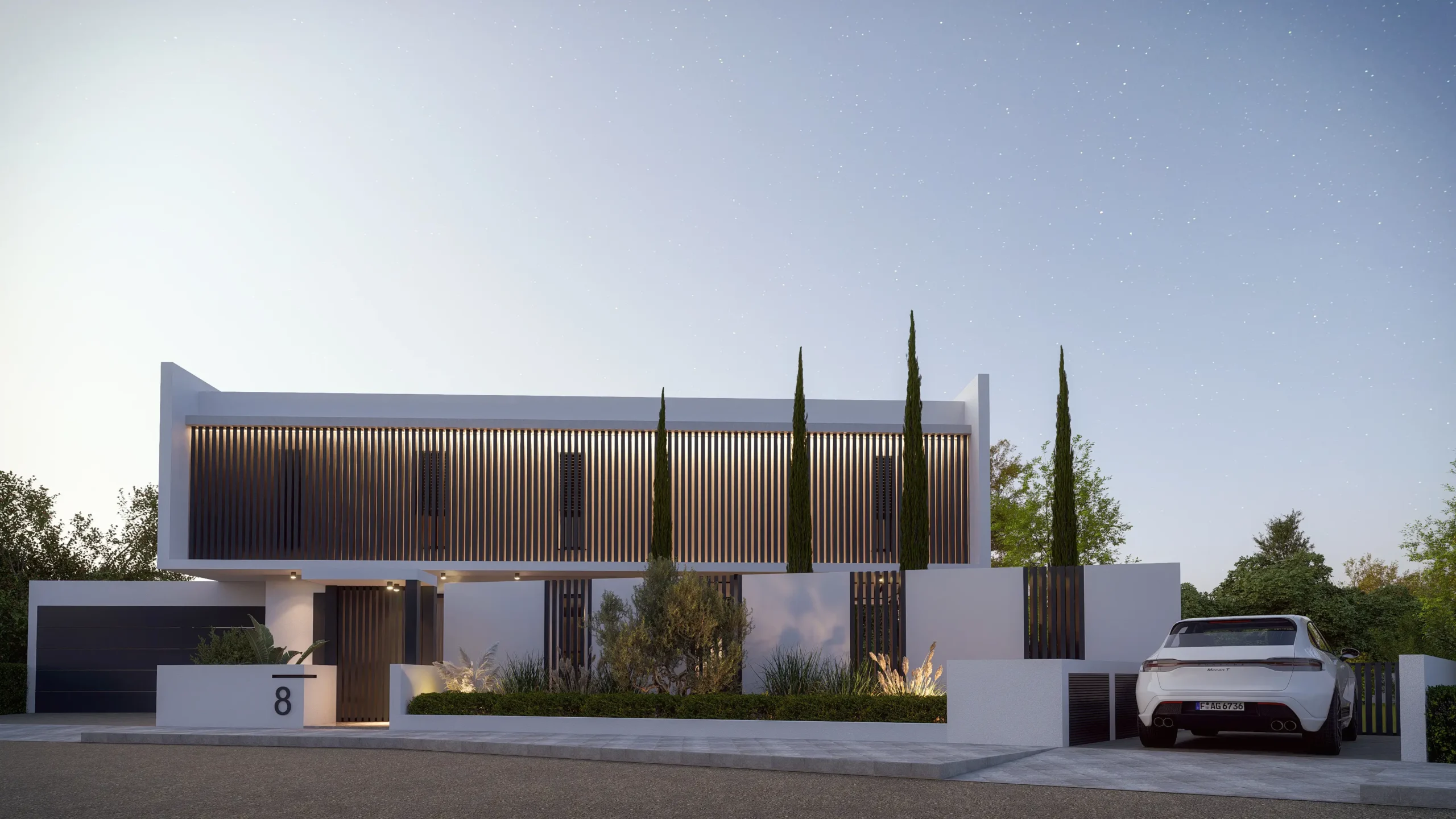A modern residence visualised with a focus on clean architecture, natural materials, and calm outdoor living. The design features a strong yet minimal façade, softened by landscaped greenery and warm lighting.