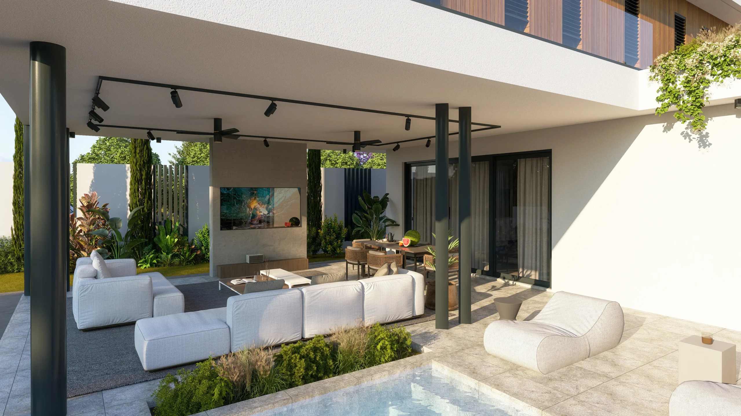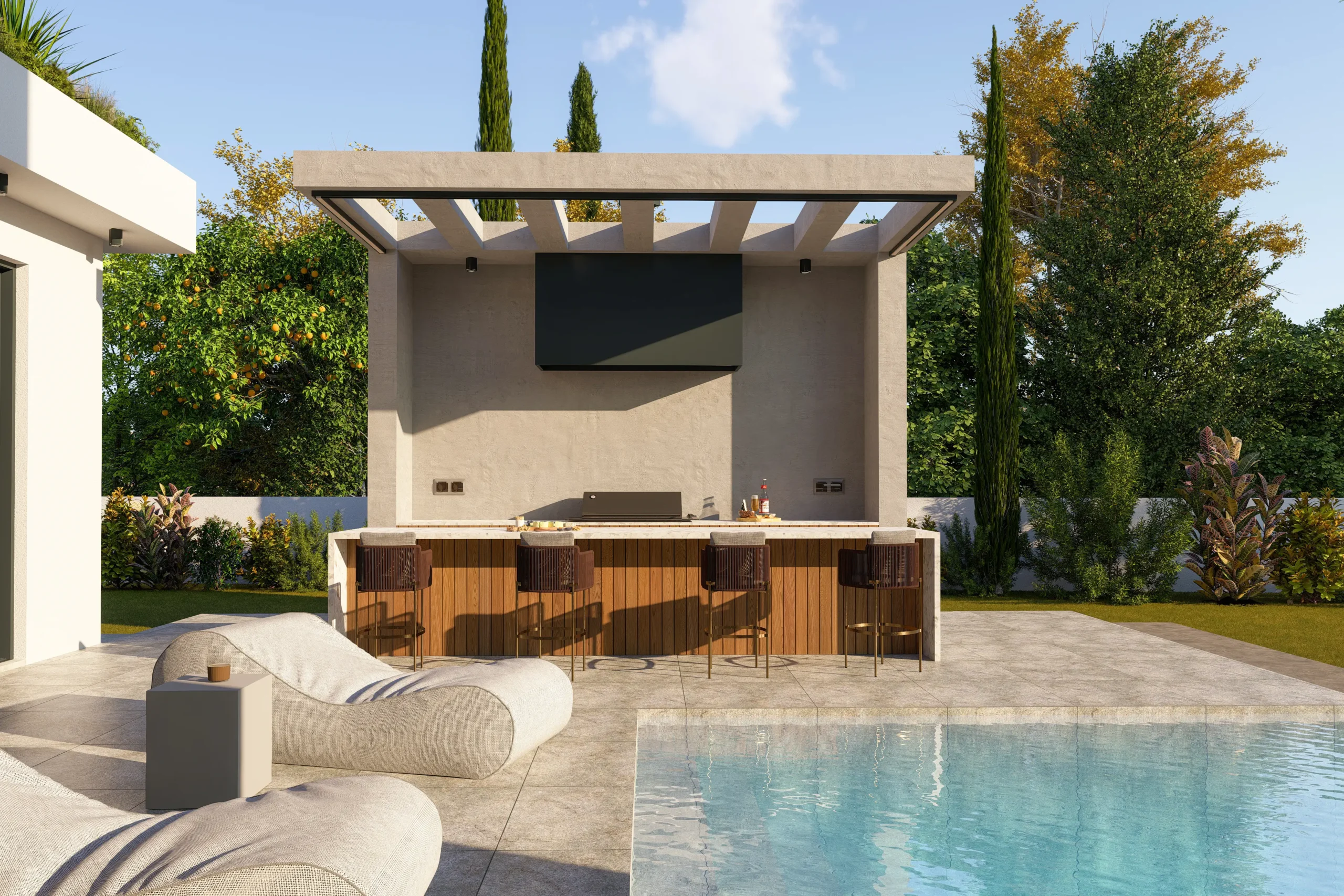 The garden is imagined as a relaxed social space, with a custom outdoor bar and seating area overlooking a clean-lined swimming pool. The visuals explore both daytime and evening moods, highlighting how light, texture, and space work together to create a comfortable and elegant home environment.
