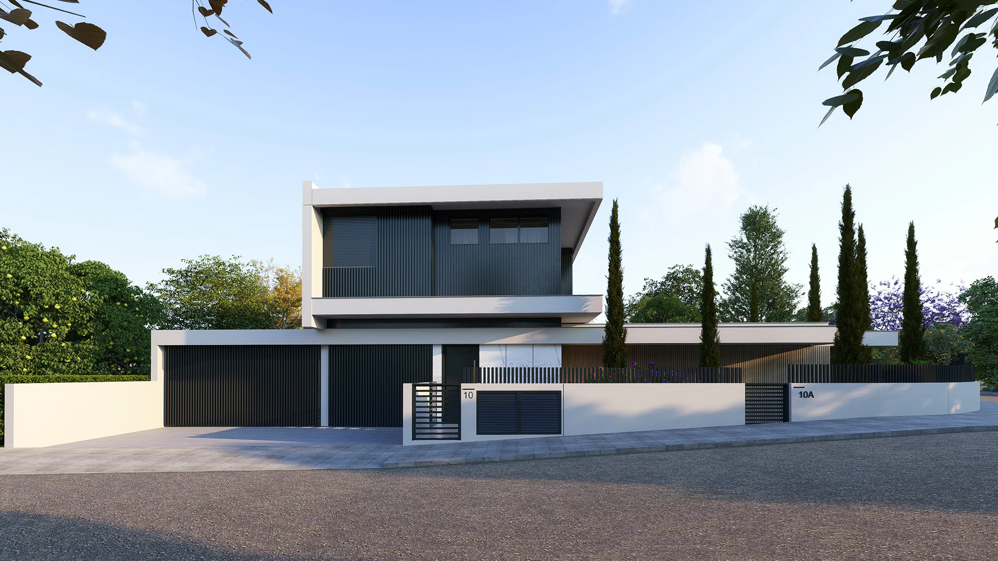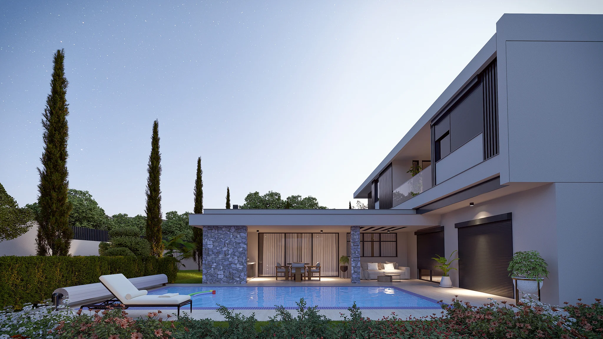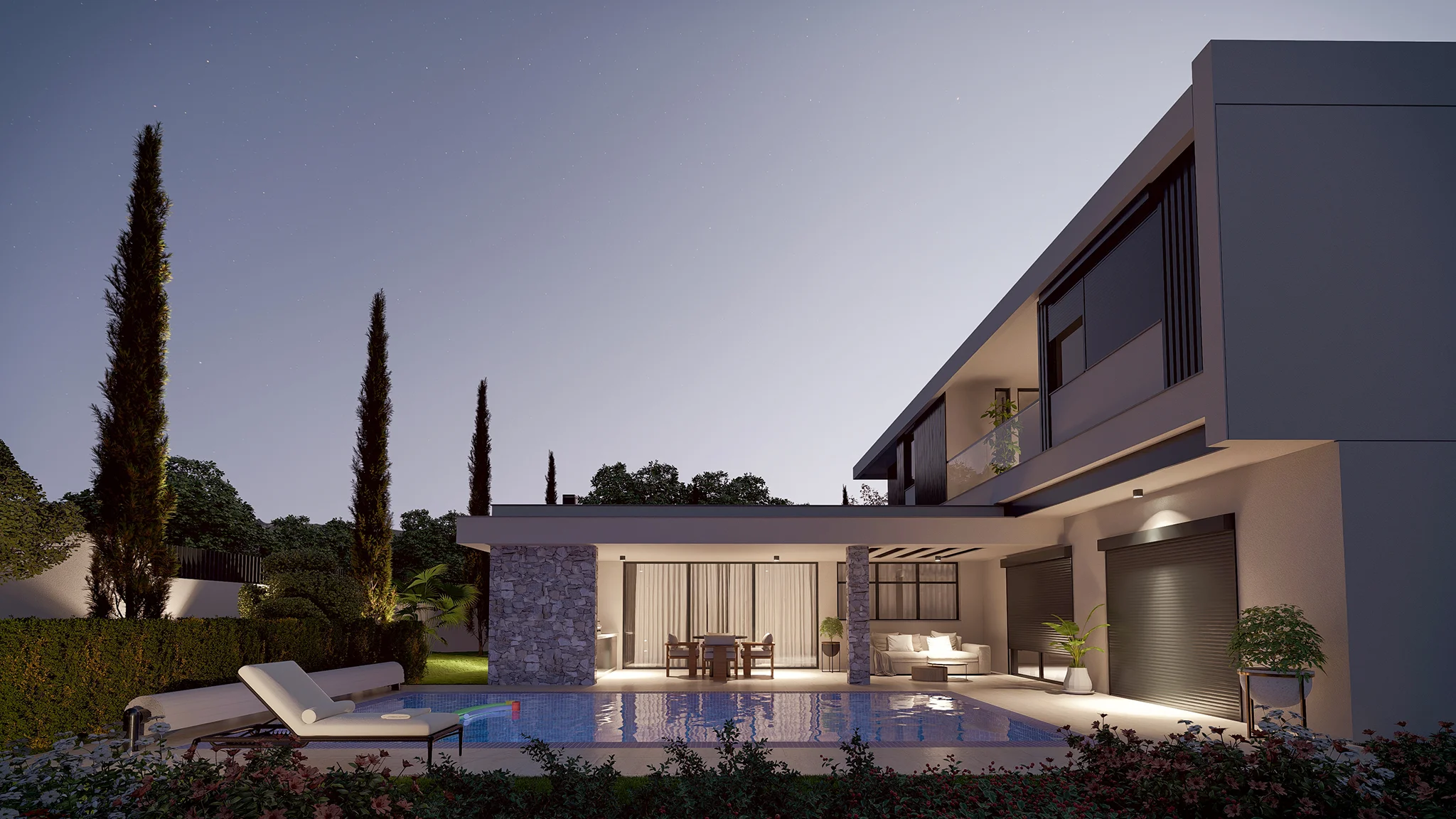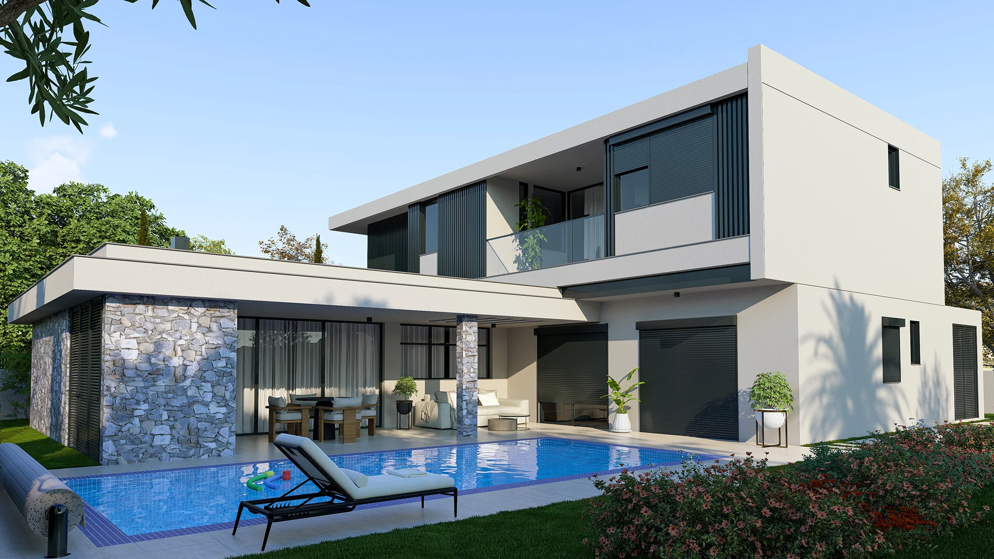 Our photorealistic renders show off the open design and striking material contrasts of this modern villa. From bright daytime shots to evening reflections in the pool, the visuals highlight the connection between architecture and nature.