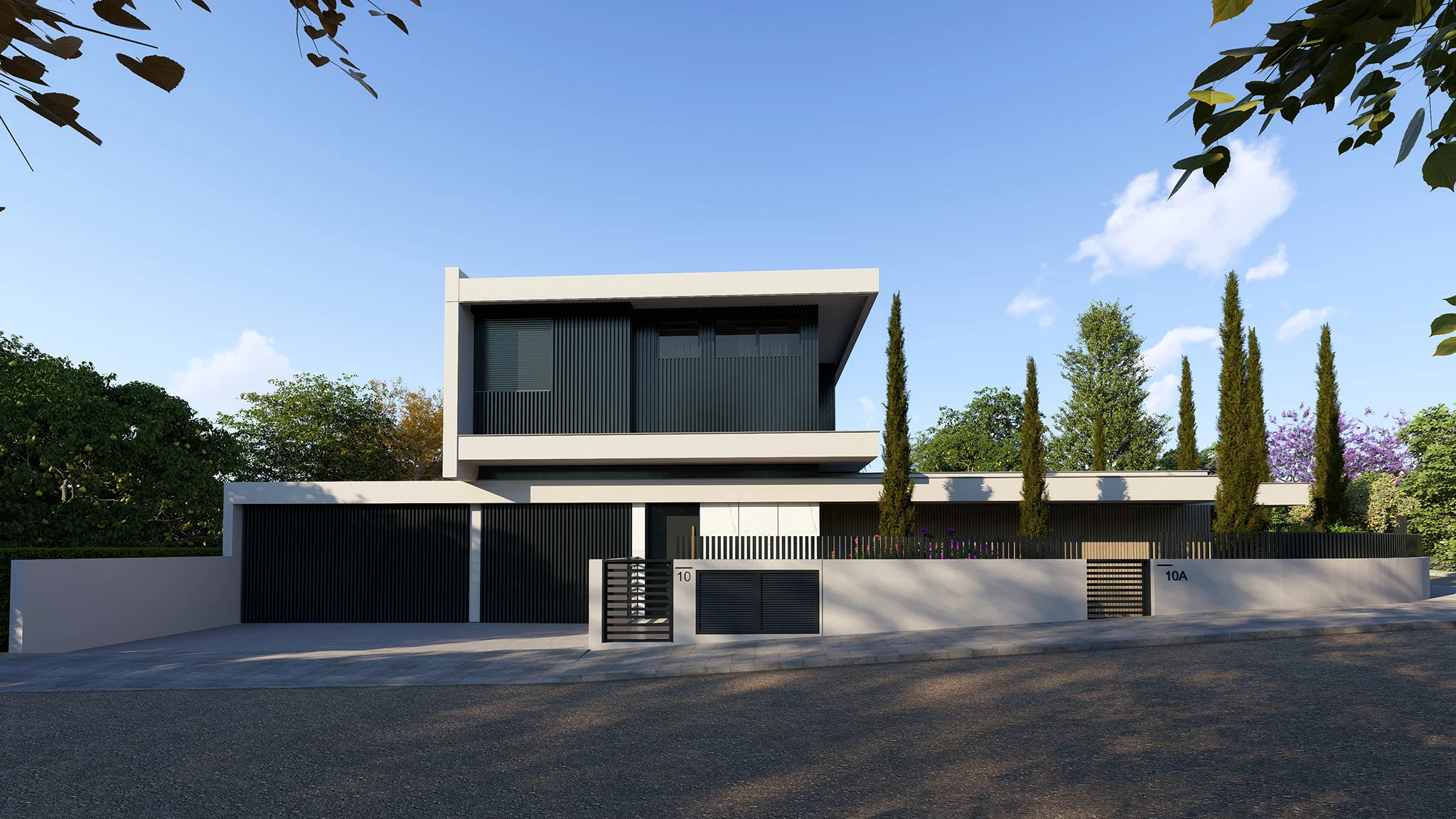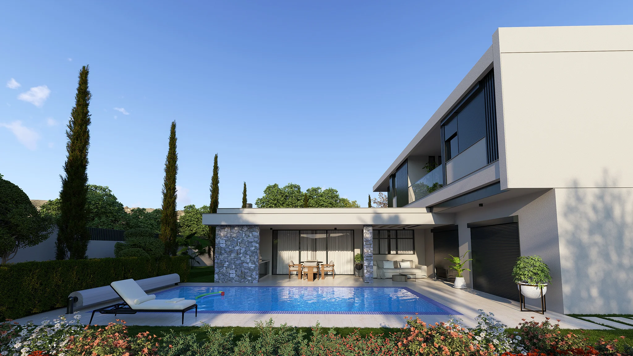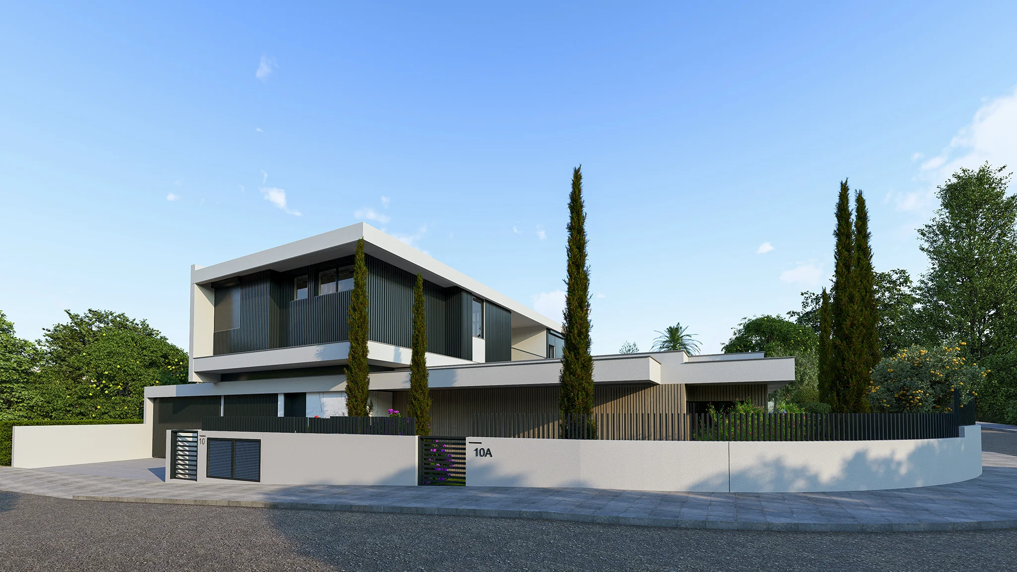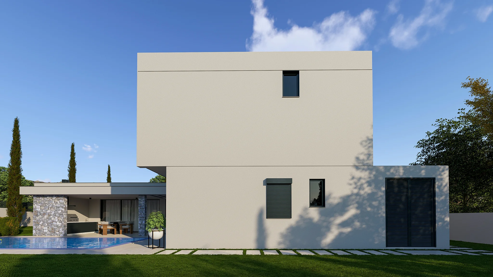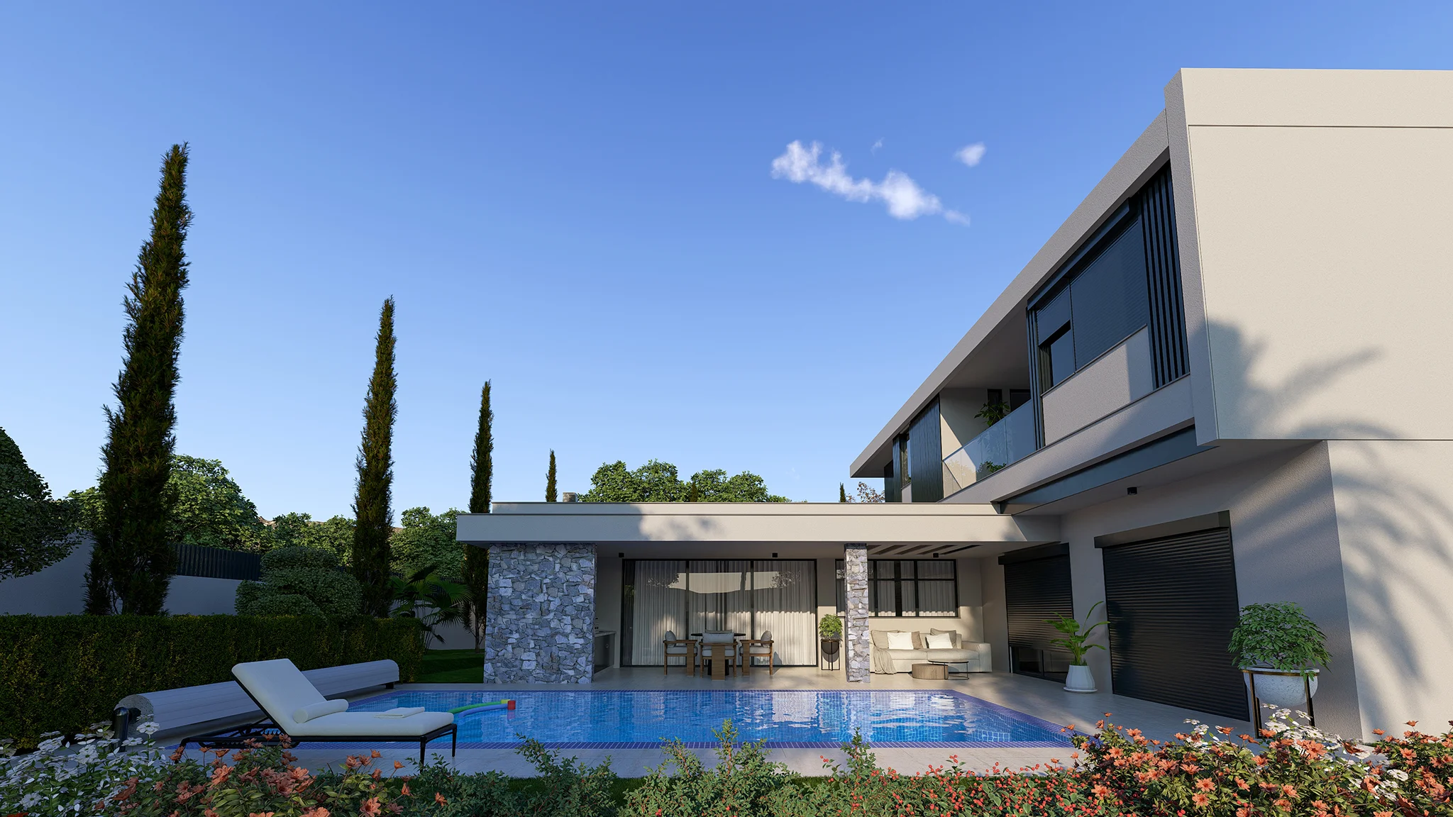 Our photorealistic renders show off the open design and striking material contrasts of this modern villa. From bright daytime shots to evening reflections in the pool, the visuals highlight the connection between architecture and nature.