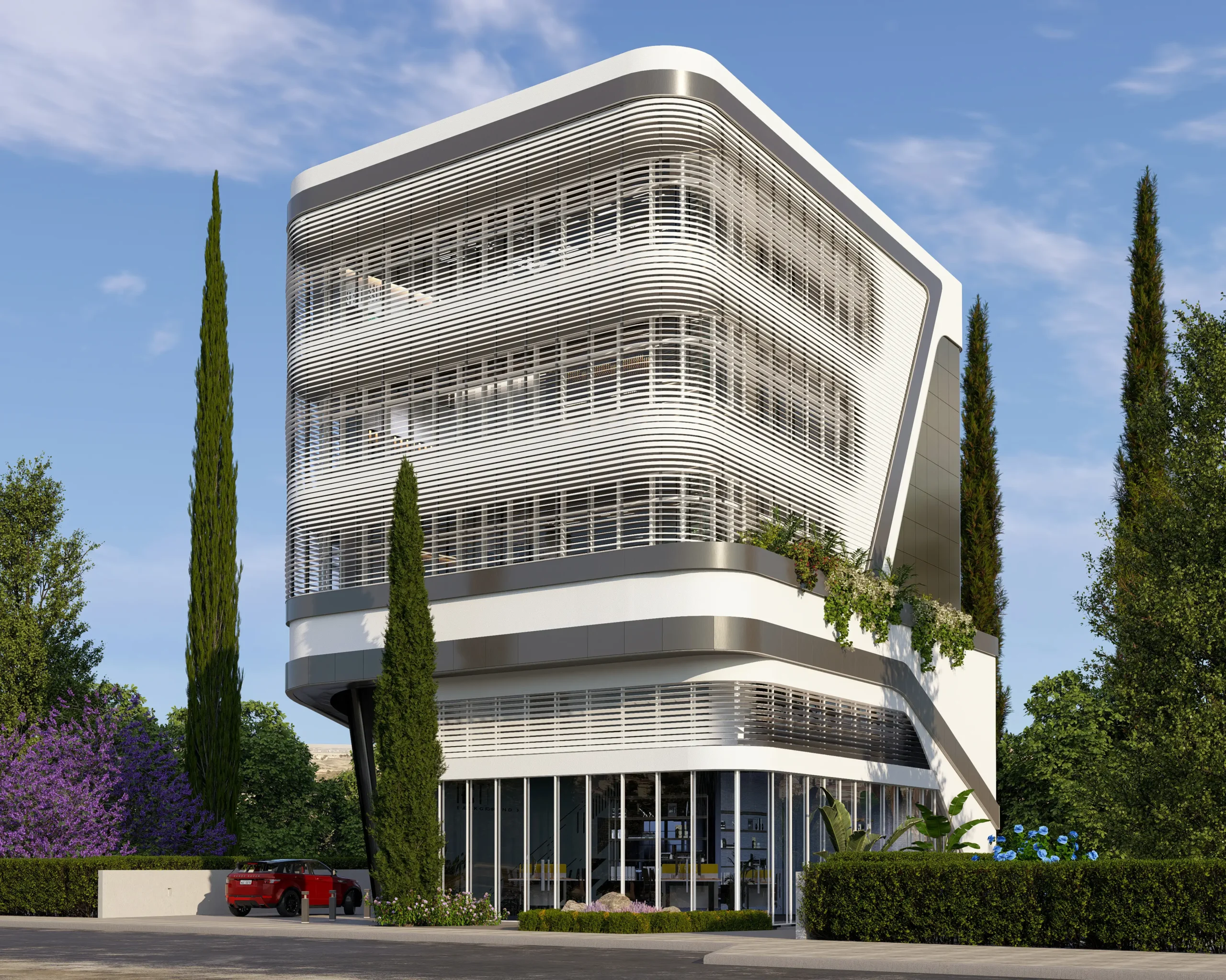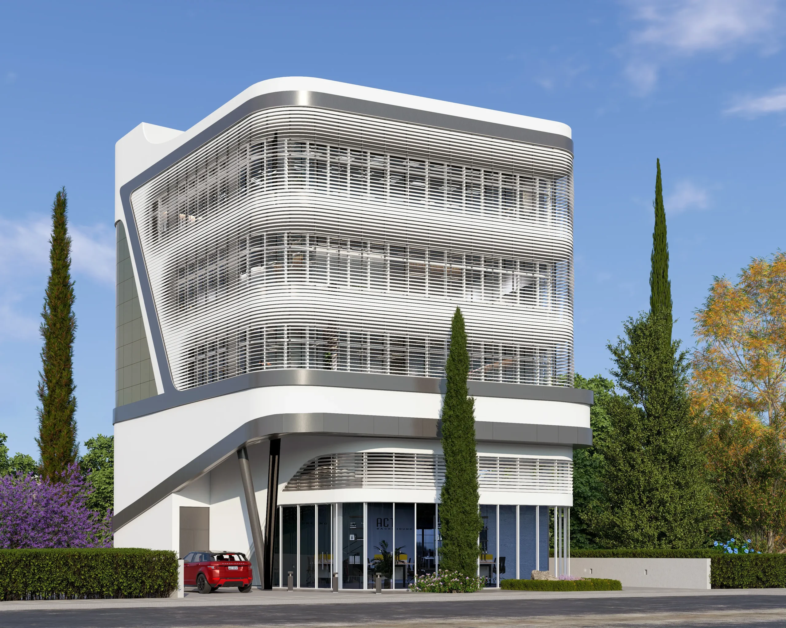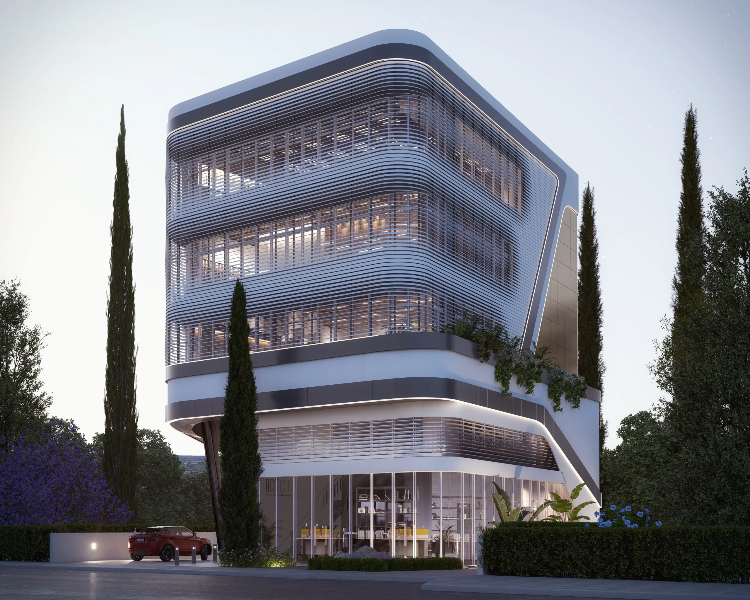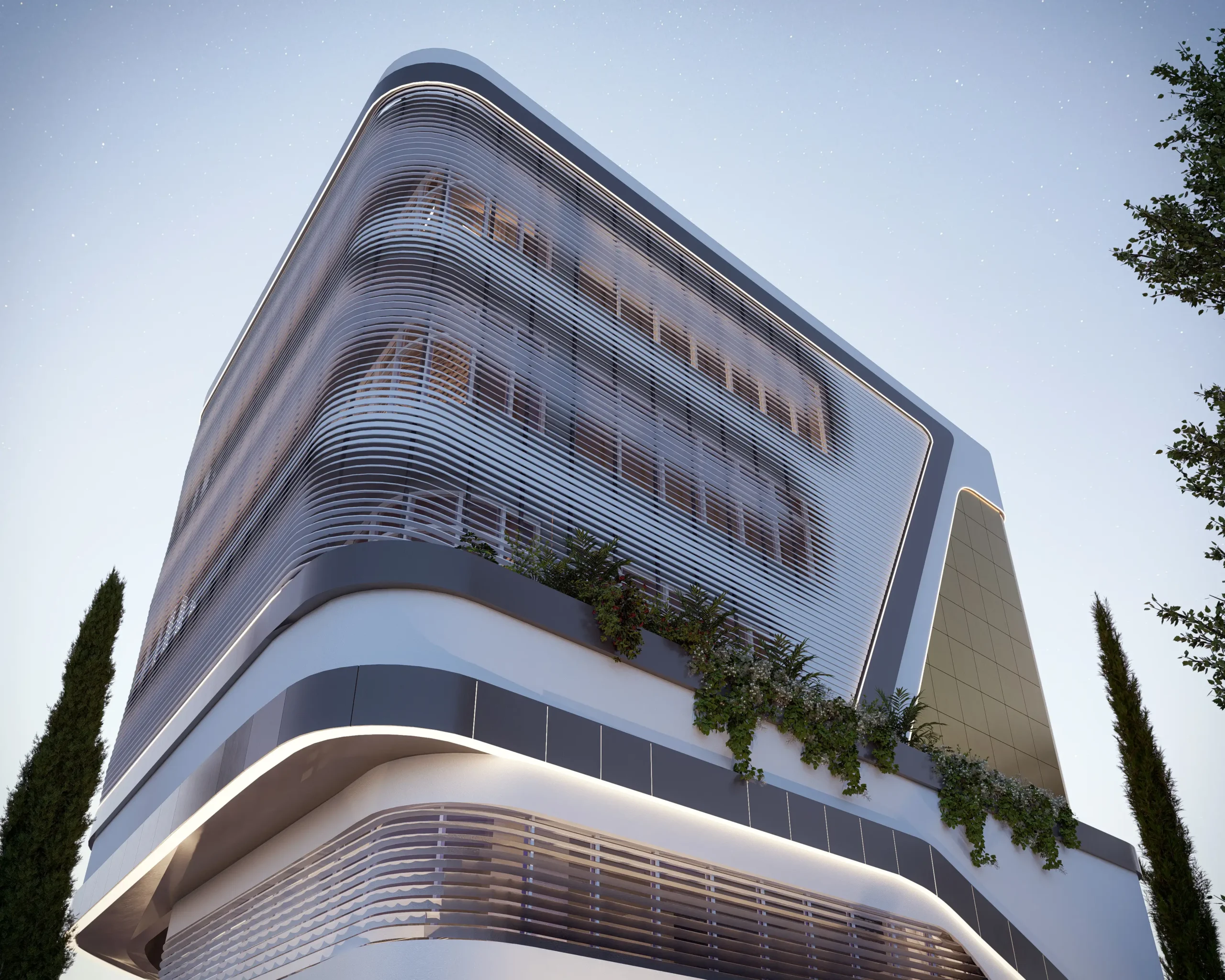 An office building that redefines modern simplicity with its fluid curves and layered façade. Designed to embrace natural light while maintaining privacy, the architecture blends precision and softness, creating a structure that feels both dynamic and calm.