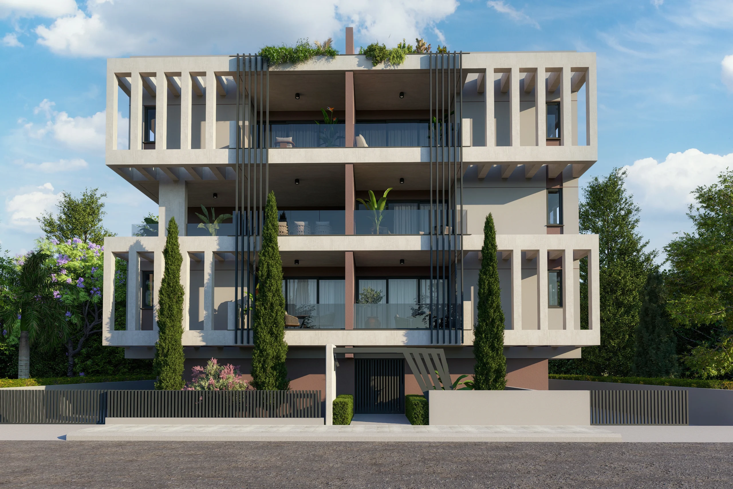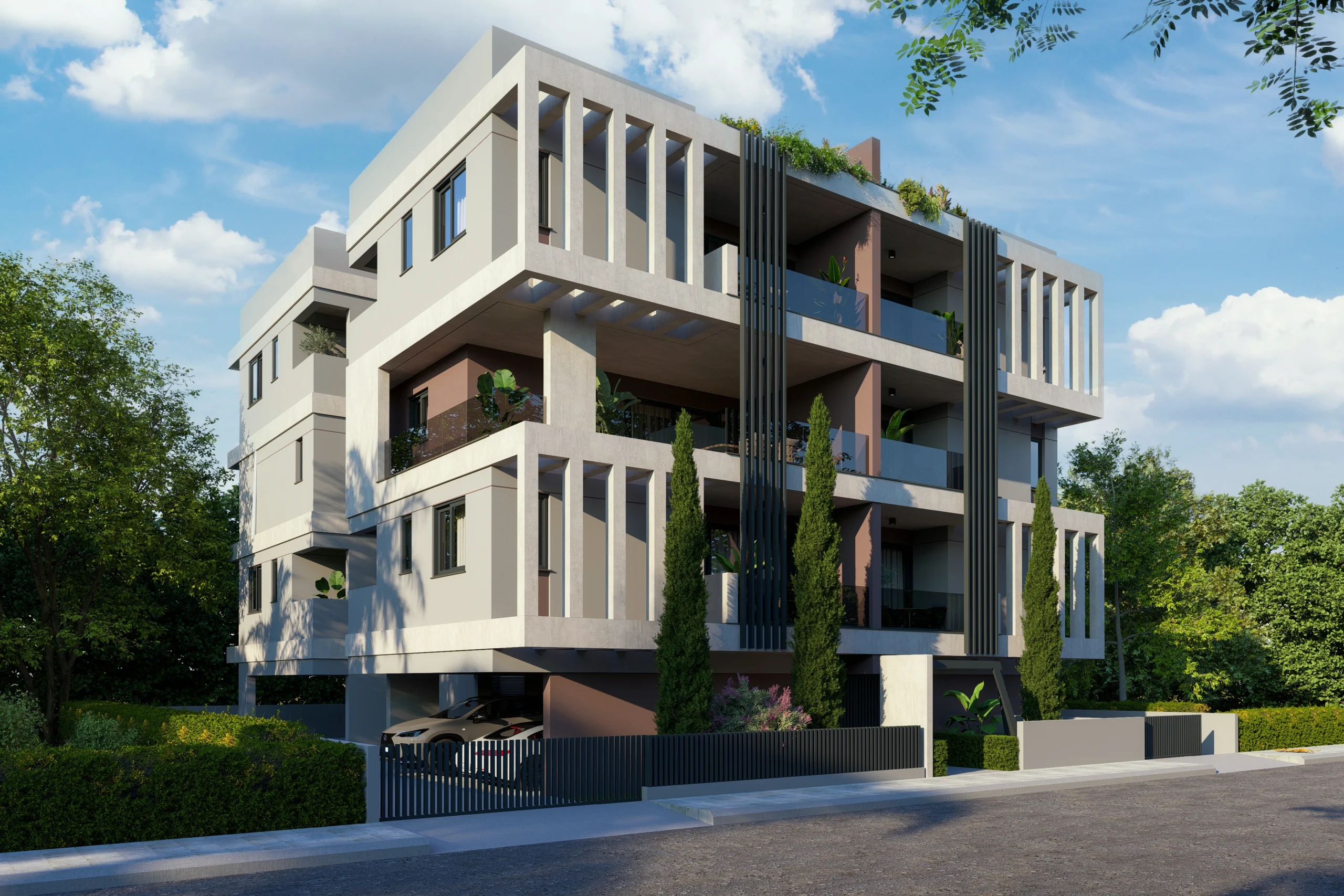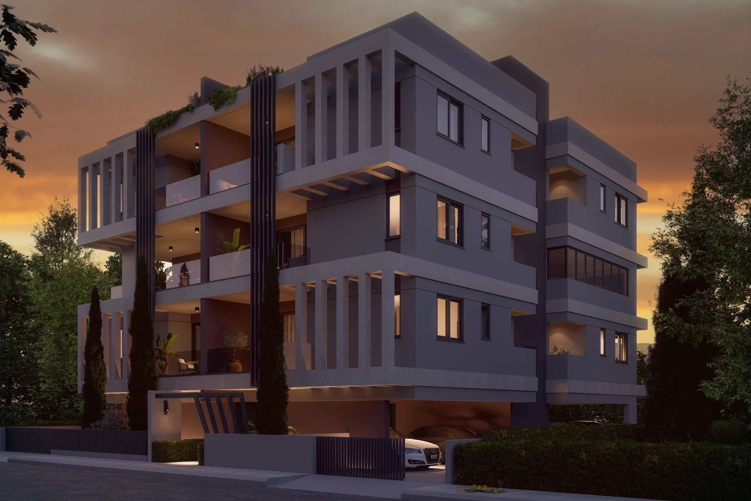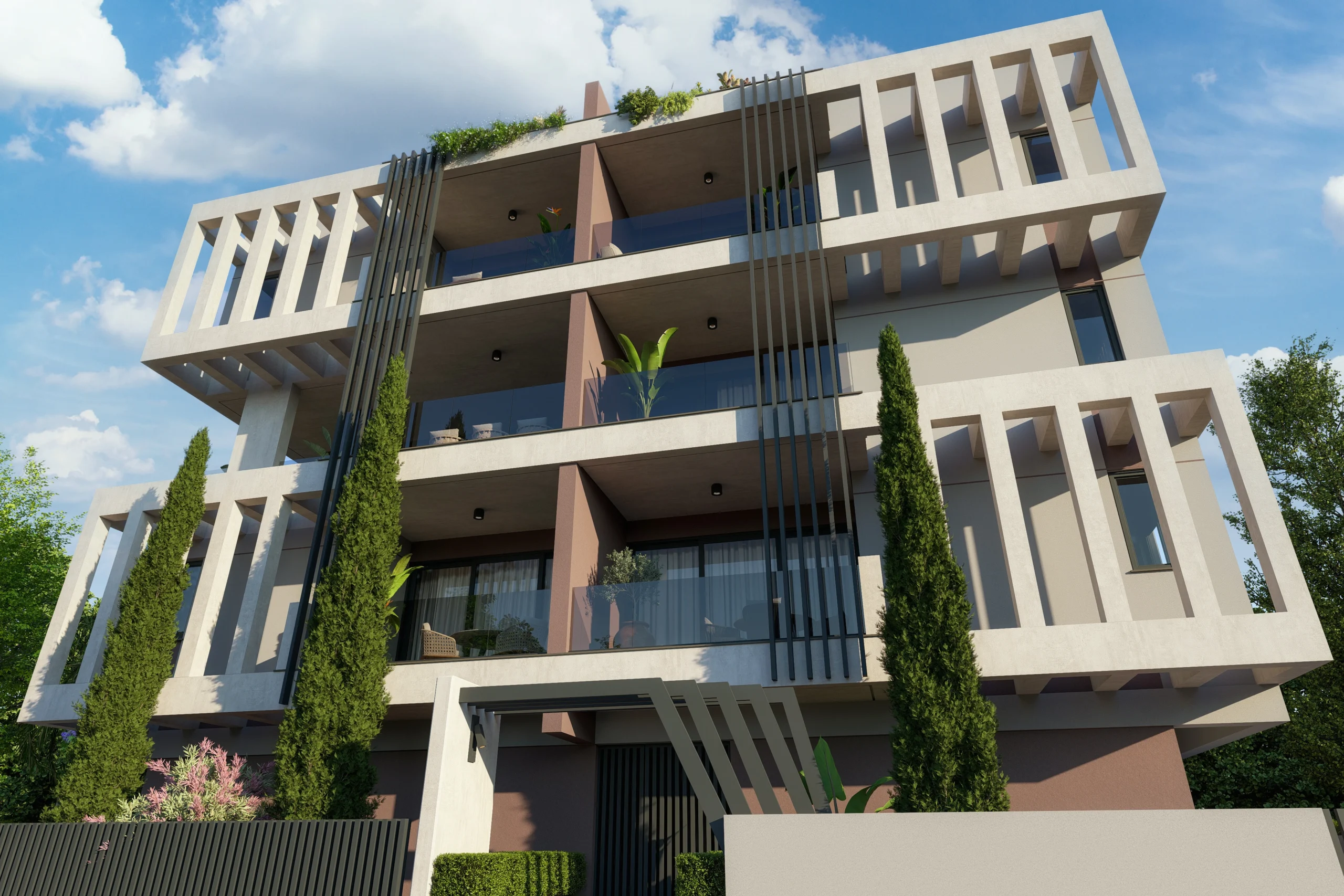A residential building shaped by clear geometry and repetition. Strong horizontal slabs are framed by vertical elements, creating depth and rhythm across the façade.